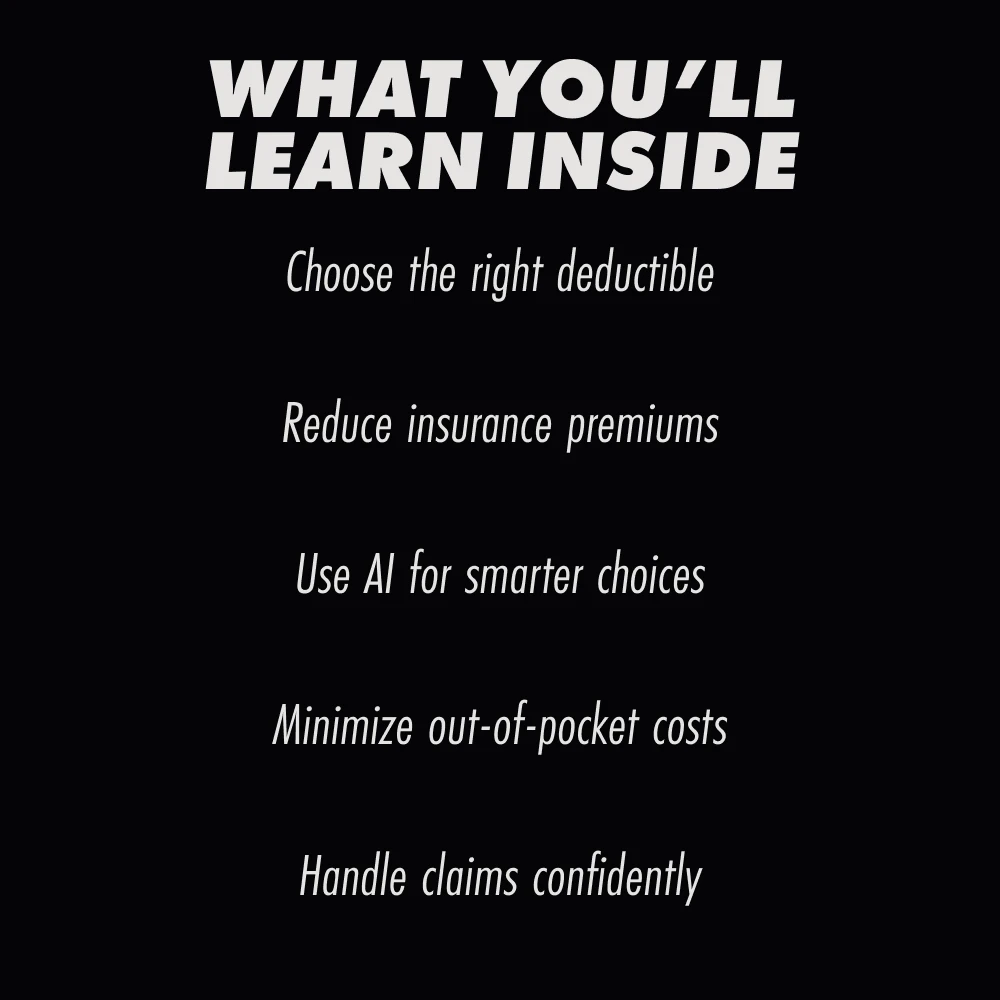 • Chapter 3: Using AI and Technology to Optimize Deductibles – Discover how AI tools can predict the optimal deductible based on your driving habits and use apps to model claim scenarios and premium impact. Learn how technology helps you avoid costly mistakes.