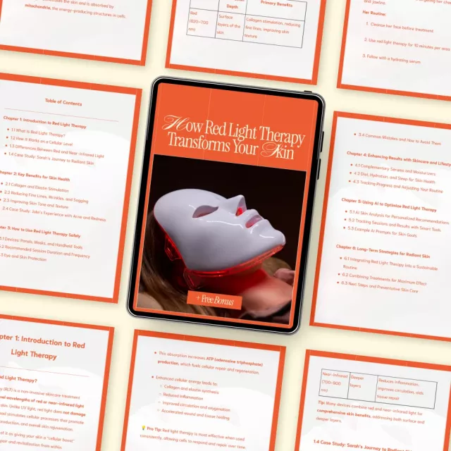 Unlike generic skincare eBooks, this guide combines science, real-world examples, and modern AI-driven optimization. You’ll not only learn how red light therapy helps skin, but also how to tailor treatments to your unique goals, track progress, and build a sustainable routine that delivers long-lasting results.