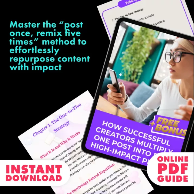 This guide is perfect for content creators, business owners, social media managers, and anyone who wants to make their content work harder. Unlike generic “content tips” eBooks, this resource is built around a tested system—the “post once, remix five times” method—that shows you exactly how successful creators maximize impact without doubling their workload.
