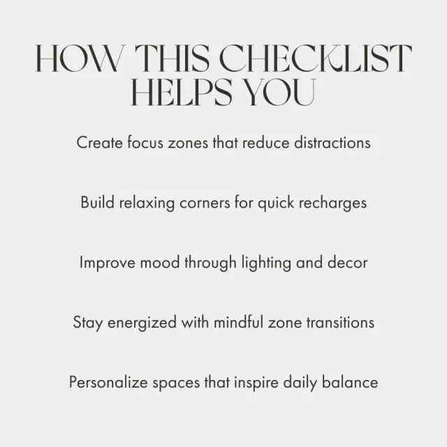 This checklist is perfect for anyone looking to master how to combine relaxation and productivity zones in their home or workspace. Whether you’re building a cozy reading nook next to your desk or designing an entire office layout, you’ll learn to blend focus and serenity in a way that fuels both work and rest.