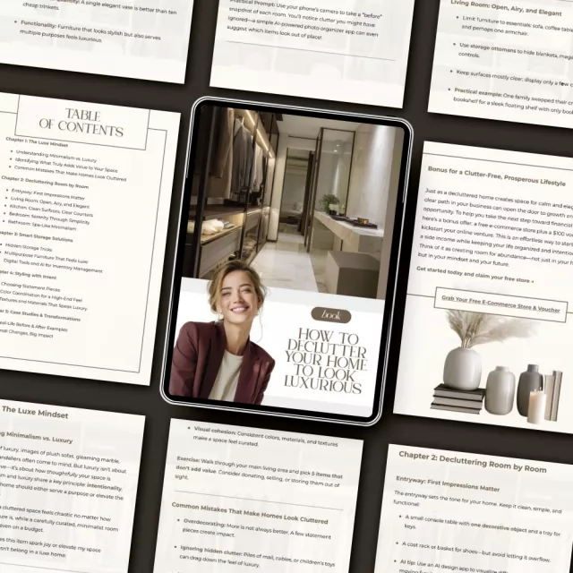 Discover how to declutter so that your home looks expensive with this beautifully designed digital eBook, How to Declutter Your Home to Look Luxurious. This in-depth guide helps you move beyond simple tidying—teaching you how to create a home that radiates calm, balance, and sophistication. Whether you’re staging your home, redesigning your living space, or just craving a touch of effortless elegance, this eBook walks you through the mindset, methods, and modern tools to make your space feel high-end without breaking the bank.
