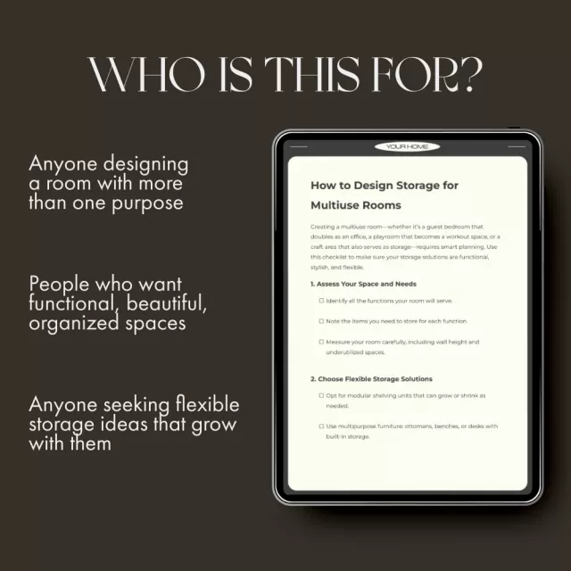 Designing a room that serves more than one purpose doesn’t have to be overwhelming. With the How to Design Storage for Multiuse Rooms checklist, you’ll have a practical, step-by-step plan to create a space that’s both beautiful and functional. Whether you’re turning a guest room into a part-time office, or a playroom into a home gym, this downloadable guide gives you all the tools to plan your layout, choose the right storage, and keep everything in order with ease.