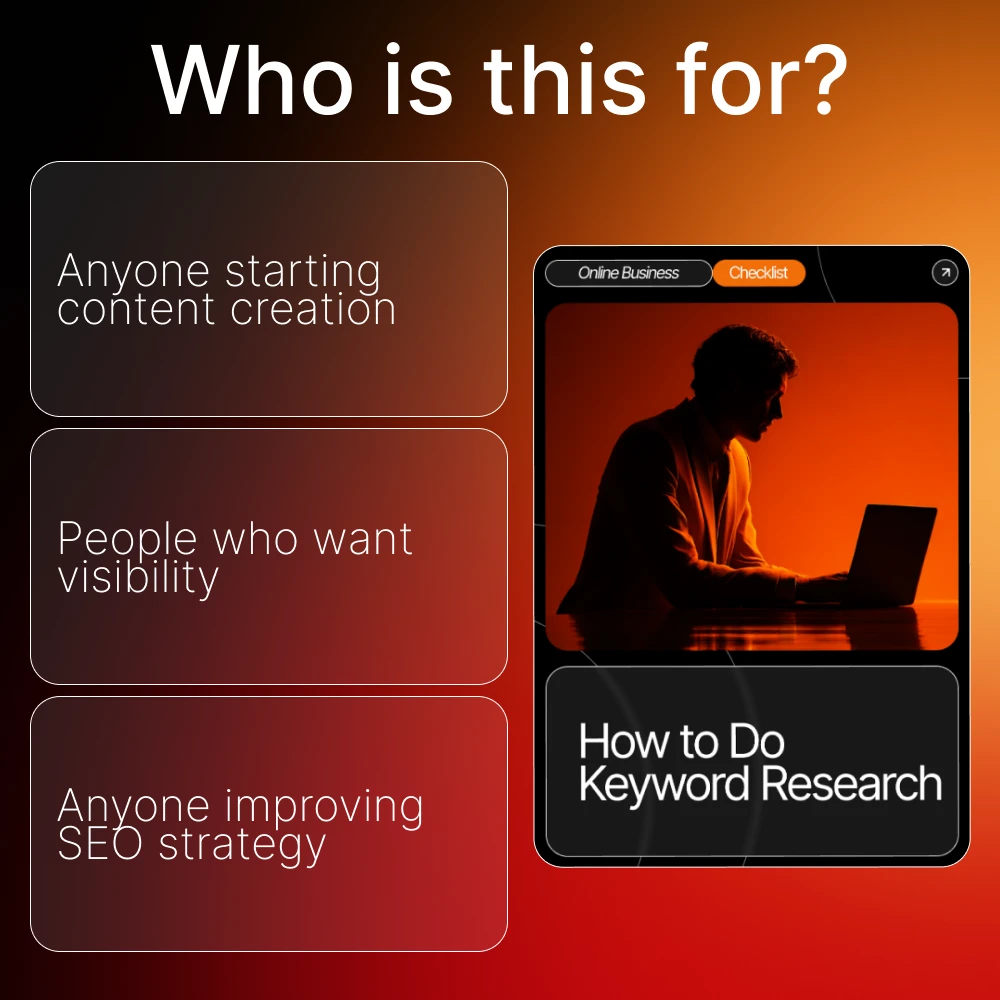 This checklist is ideal for bloggers, digital creators, freelancers, small business owners, and marketers who want an easy, effective way to find the right keywords. If you’ve ever felt overwhelmed by SEO tools or unsure where to start, this guide gives you clarity and direction.