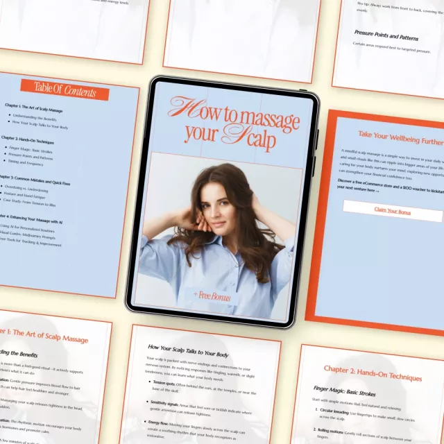 • Chapter 1: The Art of Scalp Massage – understanding the benefits and how your scalp talks to your body
