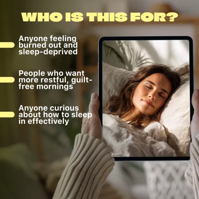 This digital guide is for anyone who wants to reclaim their mornings, restore energy, and learn how to sleep in without disrupting their life. Perfect for busy professionals, parents, students, and anyone in need of a reset. If your sleep feels rushed, restless, or rigid, this is for you.