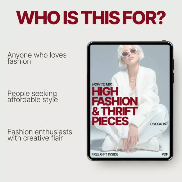 If you’re a fashion lover who loves the thrill of mixing luxury with unique, thrifted finds, this How to Mix High Fashion & Thrift Pieces Checklist is the ultimate guide to elevating your wardrobe. This digital download will teach you how to effortlessly combine designer pieces with one-of-a-kind thrift items, creating chic, personalized outfits that stand out. Perfect for fashion enthusiasts, budget-conscious shoppers, and anyone who wants to create a stunning look without breaking the bank!