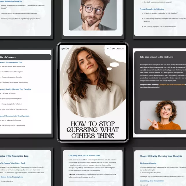 Unlike generic mindset ebooks, this guide blends psychology, communication strategies, and modern AI-supported techniques. It doesn’t just explain how to stop assuming what others think – it walks you through it step by step, with real-life scenarios and interactive prompts. It’s actionable, not just inspirational.