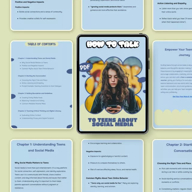 This ebook goes beyond surface-level advice. It combines real-world examples, practical prompts, and modern insights into teen behavior online. You won’t find judgment or outdated rules here. Instead, you’ll learn how to talk to teens about social media in ways that respect their independence while still prioritizing safety, mental health, and family values.
