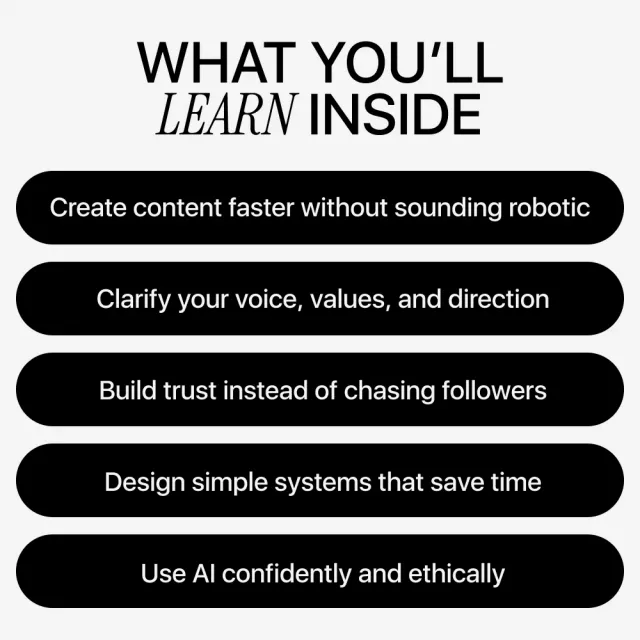 Unlike generic AI or branding guides, this ebook puts you first. It focuses on clarity before automation, ethics before shortcuts, and long-term brand trust over quick wins. You’ll learn how to use AI thoughtfully—without becoming another “fake expert” online.
