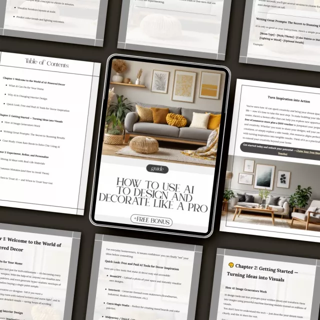 • Chapter 2: Getting Started — Learn how AI image generators work, master prompt writing, and see a real case study: From Bare Room to Boho Chic.