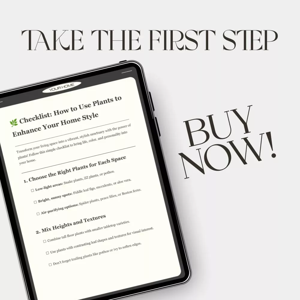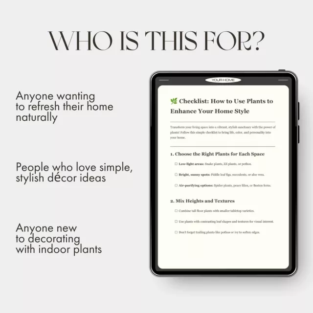 Bring life, texture, and effortless elegance into your home with How to Use Plants to Enhance Your Home Style—a beautifully designed digital checklist created to help you decorate with confidence using indoor greenery. Whether you’re a plant enthusiast or just beginning to explore the world of houseplants, this guide shows you exactly how to use plants to enhance home style and create a space that feels calm, vibrant, and uniquely yours.