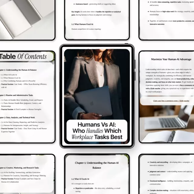 Wondering where humans truly outperform AI—and where automation should take the lead? Humans vs AI: Who Handles Which Workplace Tasks Best is a clear, practical guide designed to help modern professionals understand how to divide work intelligently. Instead of hype or fear-driven messaging, this guide gives you real-world clarity on workplace tasks humans do best vs ai, so you can work faster, smarter, and with more confidence. Whether you’re overwhelmed by new AI tools or unsure how to use them responsibly, this resource shows you how to create balance, efficiency, and better results.