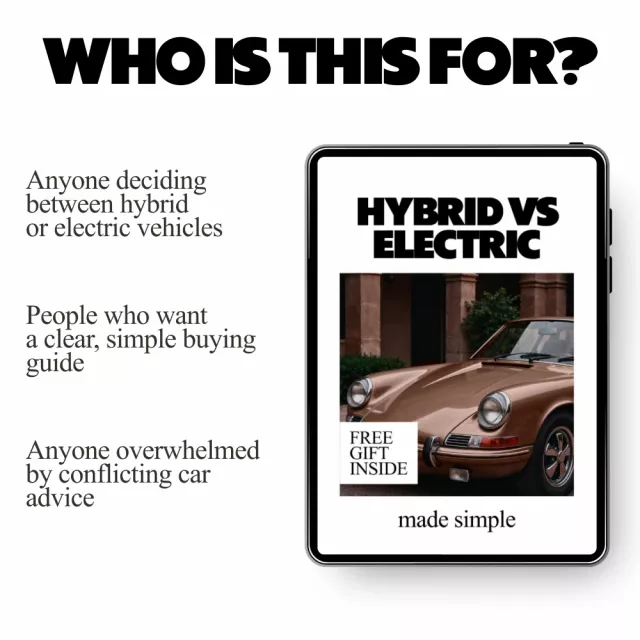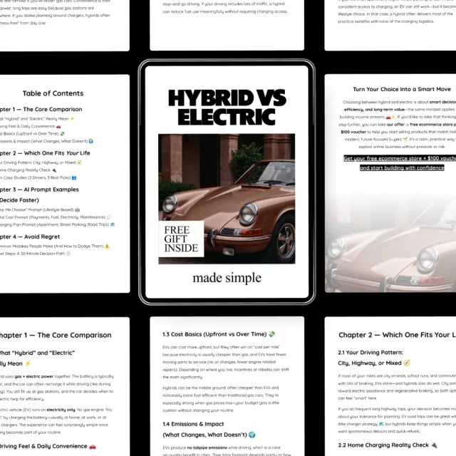 Unlike generic articles or spec-heavy reviews, Hybrid vs Electric Made Simple focuses on decision clarity. It combines lifestyle-based guidance, practical cost thinking, and AI-powered prompts you can actually use—making it faster and easier to choose with confidence.
