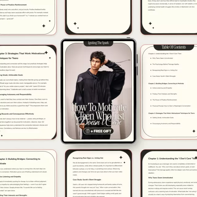 Unlike generic parenting advice, Igniting the Spark: How to Motivate a Teen Who Just Doesn’t Care combines real psychology, relatable case studies, and practical prompts you can use immediately. It focuses on long-term motivation, not short-term compliance.
