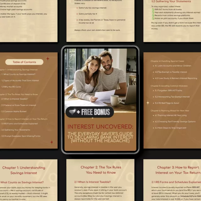 Say goodbye to tax-time confusion with Interest Uncovered: The Everyday Saver’s Guide to Declaring Bank Interest (Without the Headache) — a straightforward, practical eBook that walks you through how to declare bank interest without the stress. Perfect for everyday savers, retirees, and anyone with multiple bank accounts, this guide breaks down IRS rules in plain language so you can file your taxes accurately and confidently. Learn what counts as taxable interest, which forms to use, and how to avoid costly mistakes — all in one easy-to-follow digital download.