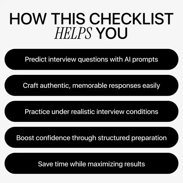 This checklist is perfect for job seekers at any stage, from recent graduates to seasoned professionals navigating career transitions. If you want to maximize your AI tools for preparation, stand out in interviews, and feel confident in every answer, this guide is for you.