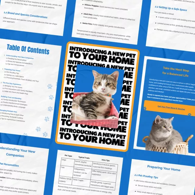 If you’re a pet owner or thinking of becoming one, this guide is designed specifically for you! Whether you’re introducing a first pet or expanding your household with multiple animals, “Introducing a New Pet to Your Home” offers a step-by-step roadmap that will help you manage every aspect of your new pet’s integration. What sets this eBook apart is its comprehensive approach, blending expert advice, real-life case studies, and even AI-powered tools to enhance your pet introduction experience.