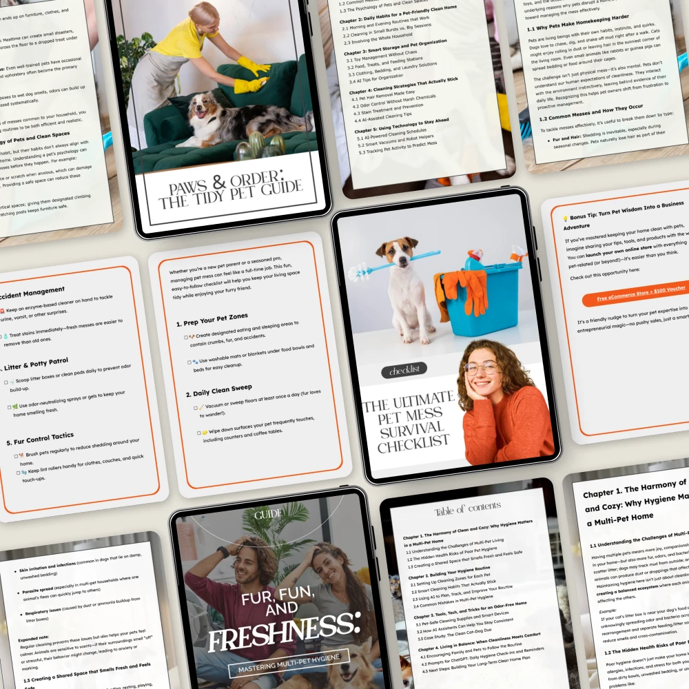 • Fur, Fun, and Freshness: Mastering Multi-Pet Hygiene – A comprehensive guide to keeping your home fresh and clean, no matter how many pets you have. Packed with expert tips and tricks, this guide will help you stay ahead of the fur and mess.