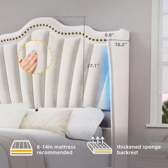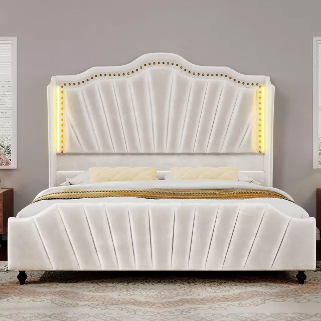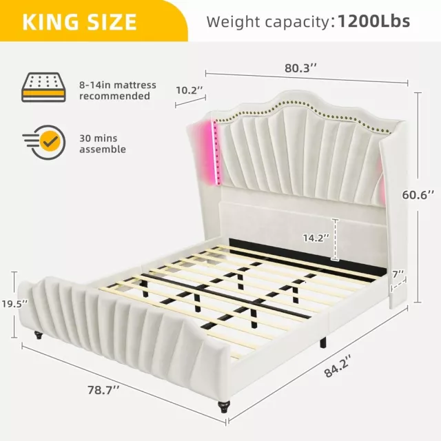 Elevate your sleeping space with this stunning King Size Platform Bed Frame, designed to blend luxury, comfort, and modern tech. With its 60.6-inch tall wingback headboard and chic velvet upholstery, this bed becomes the elegant centerpiece your bedroom deserves. Whether you’re winding down with a book or setting the mood for a relaxing evening, the built-in RGB LED lighting delivers an ambient glow that’s customizable to suit your vibe — even syncing to music. It’s more than just a bed; it’s a nightly experience.