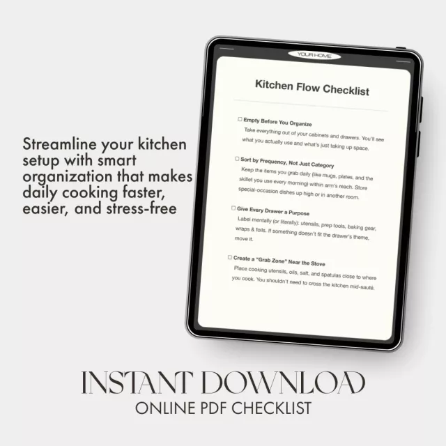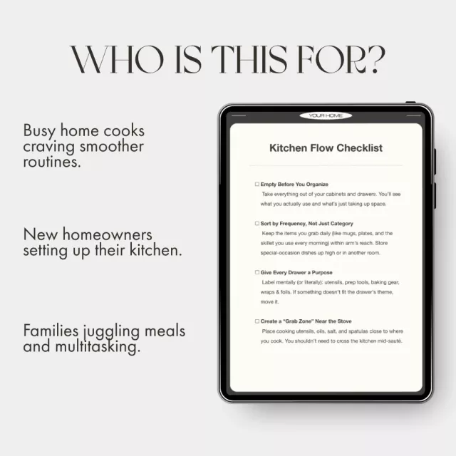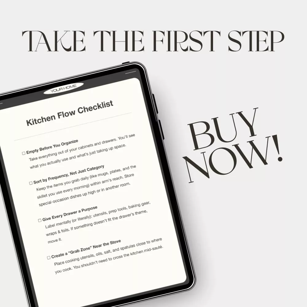 Unlike typical decluttering guides, the Kitchen Flow Checklist focuses on how you actually move and cook in your space. It’s about creating intuitive organization that fits your lifestyle — not just a prettier pantry.