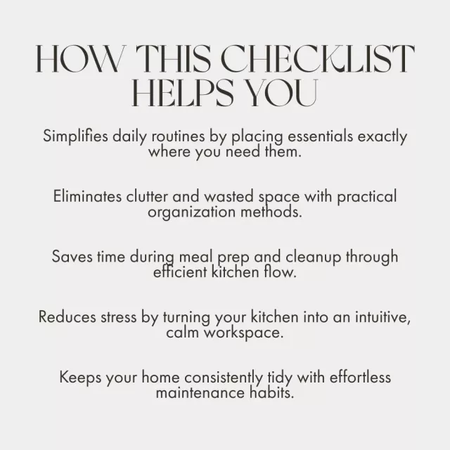 This checklist is ideal for anyone seeking a smoother, more functional kitchen — from busy parents and meal preppers to minimalists and first-time homeowners. It’s the shortcut to creating calm, flow, and order without the stress of a full renovation.