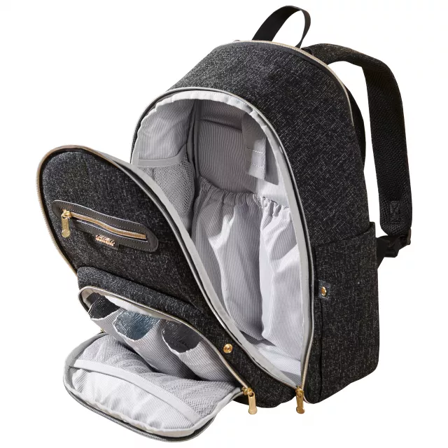 This diaper bag offers three smart opening options to suit every situation. The front opening lets you quickly reach frequently used items. Need a full view? The wide zipper opening makes packing and unpacking a breeze. And the unique back opening lets you access essentials while carrying your little one, without having to take the bag off.