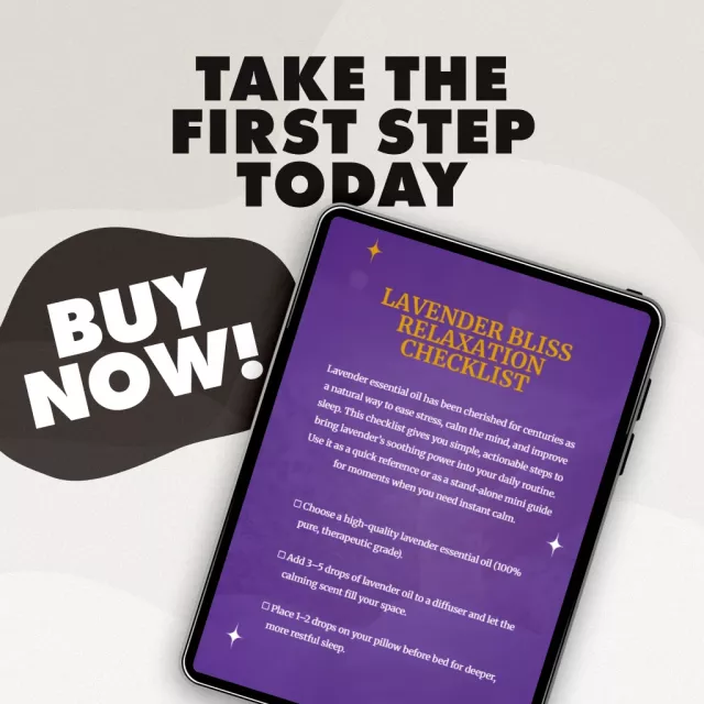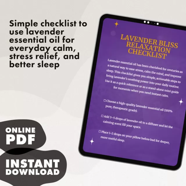 Discover the soothing power of lavender with the Lavender Bliss Relaxation Checklist, your easy-to-follow digital guide designed to help you unwind, de-stress, and create a peaceful daily routine. Whether you’re struggling with restless nights, looking for natural ways to relax, or simply want to enjoy moments of calm throughout your day, this checklist shows you exactly how to use lavender essential oil for relaxation in simple, practical steps. Perfect for beginners or anyone who loves natural wellness, this resource gives you instant access to lavender’s time-tested calming benefits.