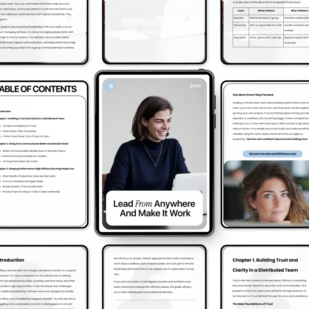 Unlike generic leadership books, this guide focuses on realistic, day-to-day leadership challenges and shows exactly how to apply AI in a human-centered way. It blends trust-building, performance management, and modern workflows into one clear system designed for remote work.