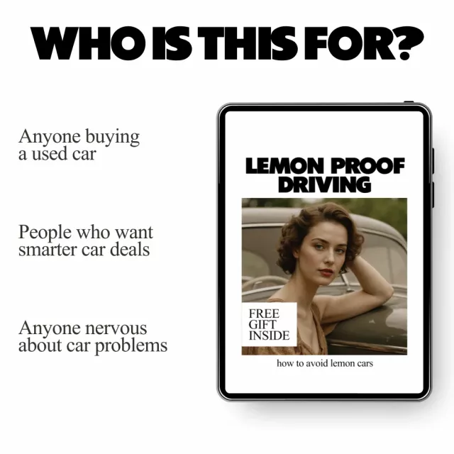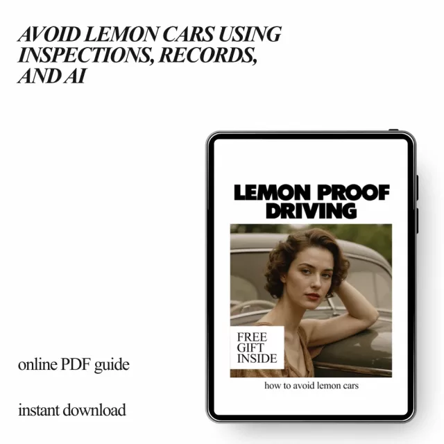 Lemon-Proof Driving is built for real buyers, not car experts. It explains how to avoid lemon cars in plain language without overwhelming you with technical jargon. What makes this ebook different is its modern approach—combining traditional inspection knowledge with smart AI research strategies so you can make better decisions faster. You don’t just learn what to check, you learn how to think like a confident buyer.
