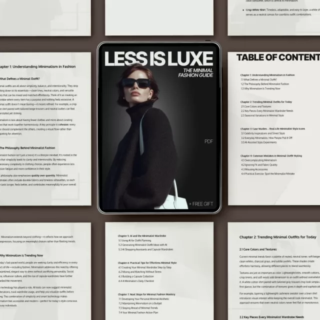 Ready to transform your wardrobe and elevate your style? Download Less Is Luxe: The Minimal Fashion Guide now and start curating your perfect minimalist wardrobe today. Take the first step toward mastering the art of minimalist fashion with a resource that’s as sleek and simple as the style it teaches!