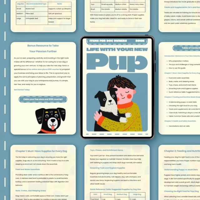 Bringing home a new puppy is one of life’s greatest joys—but it can also be overwhelming if you don’t know where to start. Life with Your New Pup is a beautifully designed eBook that walks you through everything you need to prepare for, care for, and bond with your new best friend. Whether you’re a first-time dog owner or simply want to refresh your knowledge, this guide covers all the must have items for new dog owners and much more. Download it instantly and start your journey with confidence and clarity.