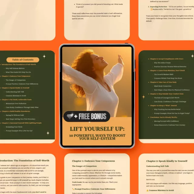 You are already worthy—this ebook helps you believe it. Download Lift Yourself Up: 10 Powerful Ways to Boost Your Self-Esteem today and start creating lasting confidence, one small step at a time.