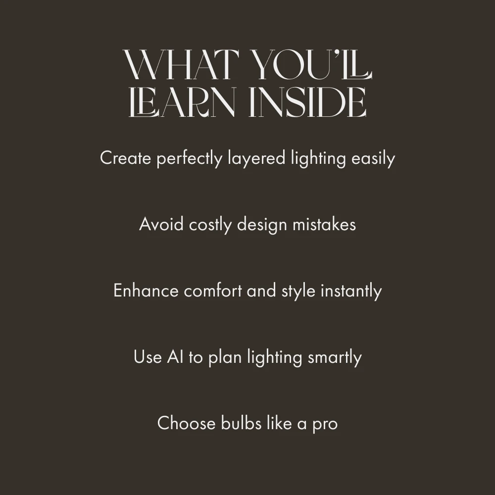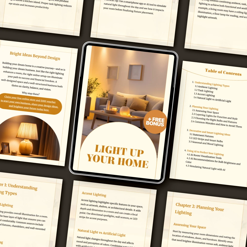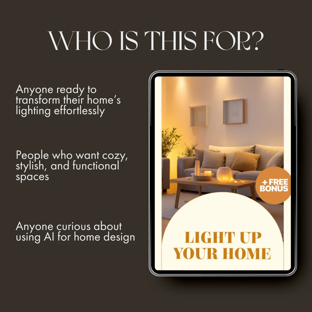 Unlike other digital lighting resources, Light Up Your Home combines practical lighting theory with cutting-edge AI-powered design tools. You’ll not only learn lighting design fundamentals but also how to use modern technology to visualize, plan, and perfect your setup — all in one easy-to-use eBook.