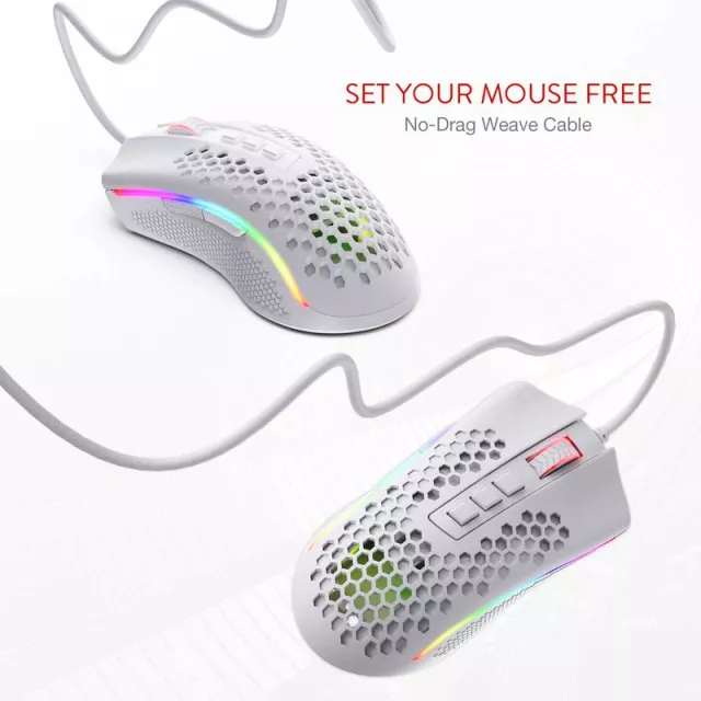 What makes this mouse special? Its balance of ultra-light construction and powerful performance. The honeycomb shell design reduces weight without sacrificing durability, making it perfect for competitive play. The customizable DPI and RGB settings allow you to personalize your experience for every game, while the no-drag weave cable keeps you moving fast and free. Whether you’re deep into an MMO, climbing the ranks in an FPS, or simply working on your next project, this mouse adapts to your needs with ease.