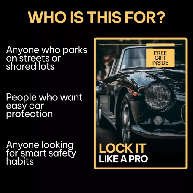 Lock It Like a Pro is a practical, easy-to-follow digital guide designed to help you protect your vehicle using everyday habits and modern tools. Instead of overwhelming you with expensive gadgets or technical jargon, this guide focuses on simple actions that make a real difference. Whether you park on busy city streets, in shared apartment lots, or right in your own driveway, this resource shows you how small choices can dramatically reduce your risk. Clear, modern, and designed for real life, this digital download fits perfectly into your daily routine.