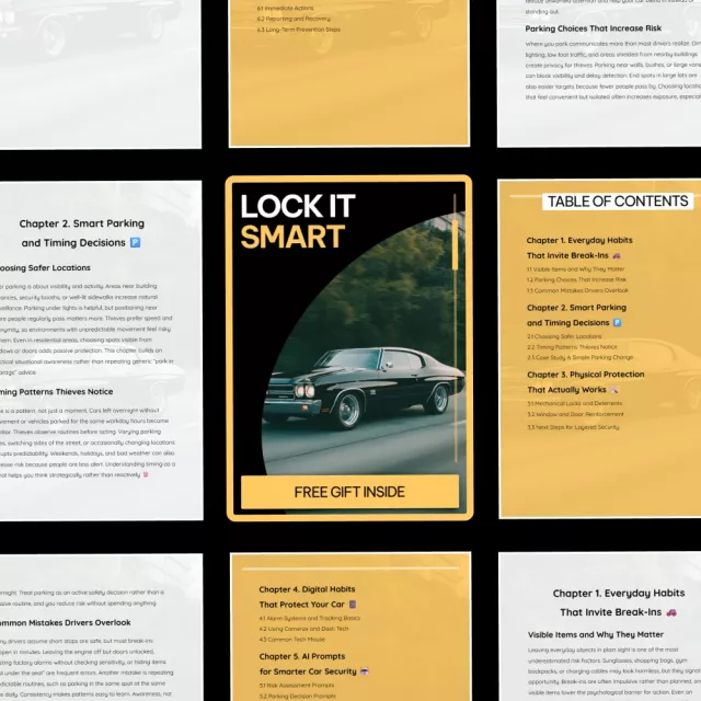 Lock It Smart is a practical, easy-to-follow digital guide designed to help you reduce the risk of car break-ins using everyday habits, smarter parking decisions, and modern security tools. Instead of overwhelming you with technical jargon, this guide focuses on realistic actions you can take immediately. From simple visibility changes to advanced AI prompts that help you assess risk, Lock It Smart empowers you to protect your vehicle with confidence—no matter where you park.
