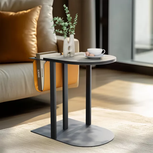 What sets this C-Shaped End Table apart is its unique combination of form and function. Not only does it serve as a stylish side table, but it also features a convenient leather magazine sling that adds both storage and charm. The quality construction, with a grey leather top and iron frame, creates a timeless piece that is both durable and easy to maintain. The color combination of khaki, orange, and black adds a pop of color and warmth to your space, making it a statement piece in any room.