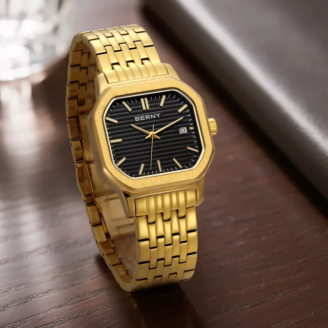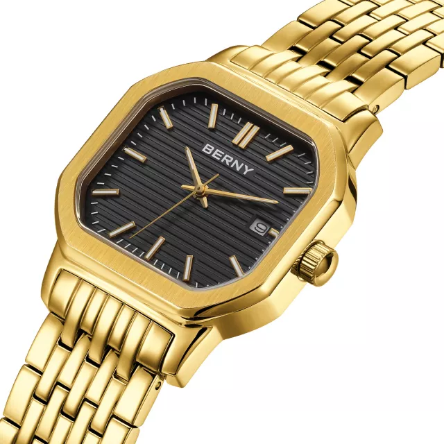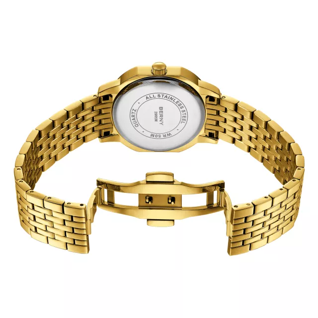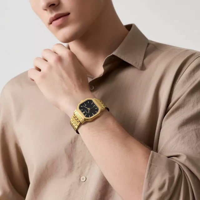 At the heart of this watch lies a Japanese quartz movement, ensuring accurate timekeeping you can rely on. The mineral glass with sapphire coating provides exceptional scratch resistance, keeping the golden glow pristine for years. Its slim 0.32 in. case thickness and sleek rectangular profile make it elegant yet comfortable for all-day wear. The IP-plated stainless-steel case and bracelet are paired with a butterfly clasp for a secure and seamless fit, adding to its sophisticated appeal.