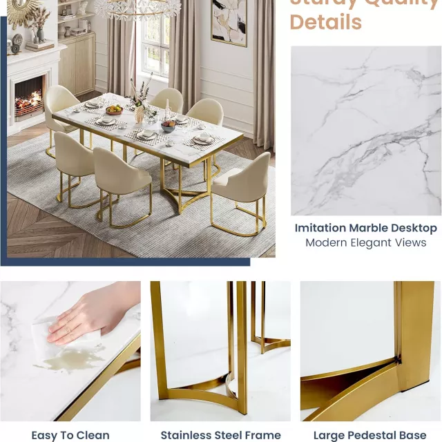 Luxury White Marble Dining Table for 6 with Gold Legs – 71″ Modern Design