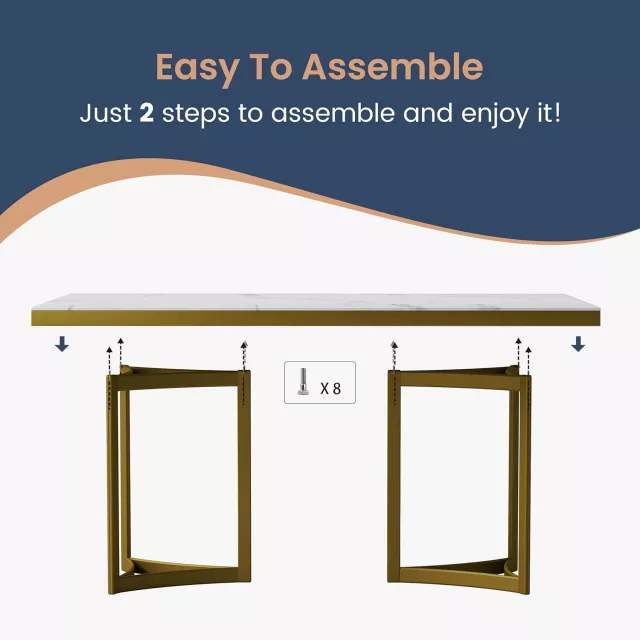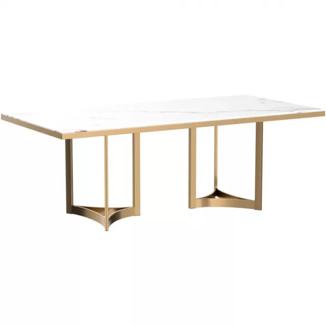 Sturdy gold stainless steel legs with a brushed finish support the top with both grace and strength. Designed with advanced drawing technology, the legs are not only beautiful but also resistant to paint chipping, ensuring this piece stays stylish for years to come. Measuring 70.87 inches long by 35.43 inches wide and standing 29.53 inches high, this table comfortably seats 6 to 8 guests.