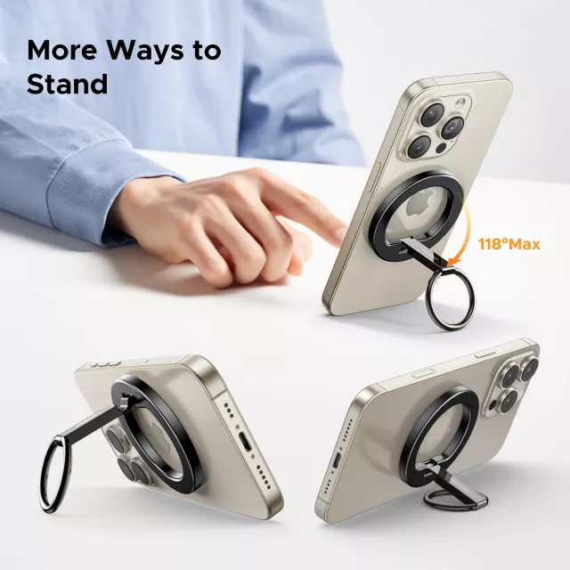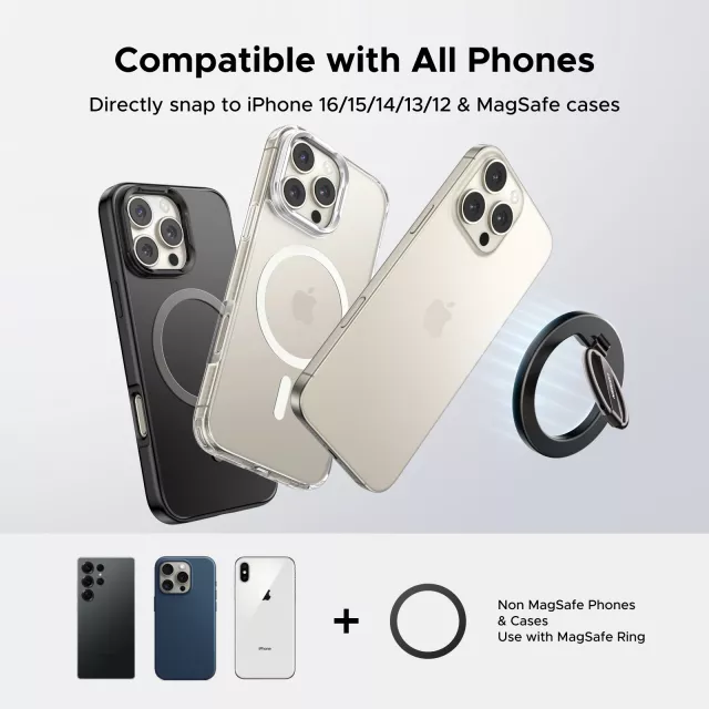 This phone ring holder is built from durable aluminum alloy, making it lightweight yet strong. It attaches magnetically to your MagSafe-compatible phone or case and works universally with most iPhone and Android models. The rotating ring design allows for full 360° movement and doubles as a stand for hands-free viewing in both portrait and landscape mode. No charger, no speaker, just a simple and powerful everyday tool for your phone.
