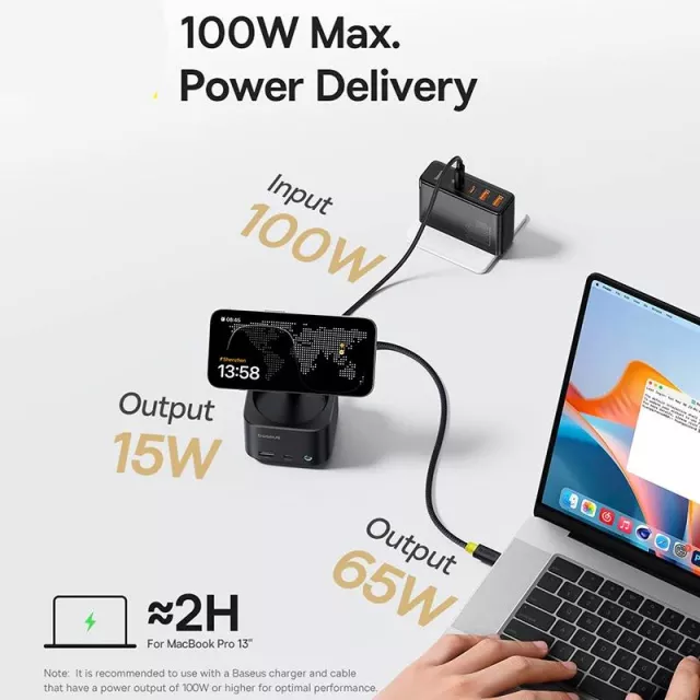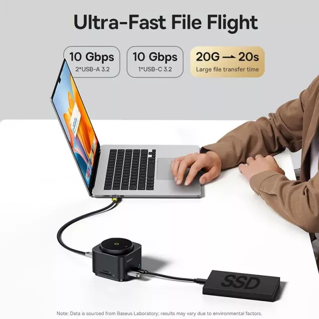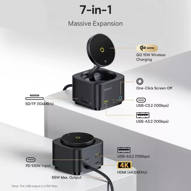 This hub combines fast wireless charging with powerful wired connections. Its 100W PD input ensures your laptop stays charged while delivering up to 65W output to connected devices. Enjoy 4K@60Hz ultra-HD video output for crystal-clear displays, plus 10Gbps USB-C and USB-A ports for lightning-fast file transfers. With dual card readers supporting up to 104MB/s, moving media files has never been easier. A built-in screen-off button gives you instant privacy with just one click.