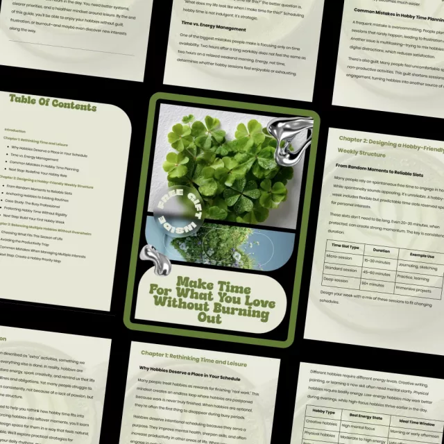If you’re ready to stop postponing what you love and start building hobby time that fits your real life, download Make Time for What You Love Without Burning Out today. This eBook gives you a clear path to enjoying your interests consistently, without burning out or falling behind.