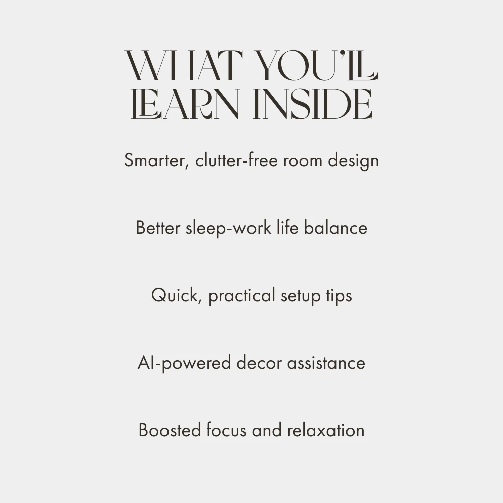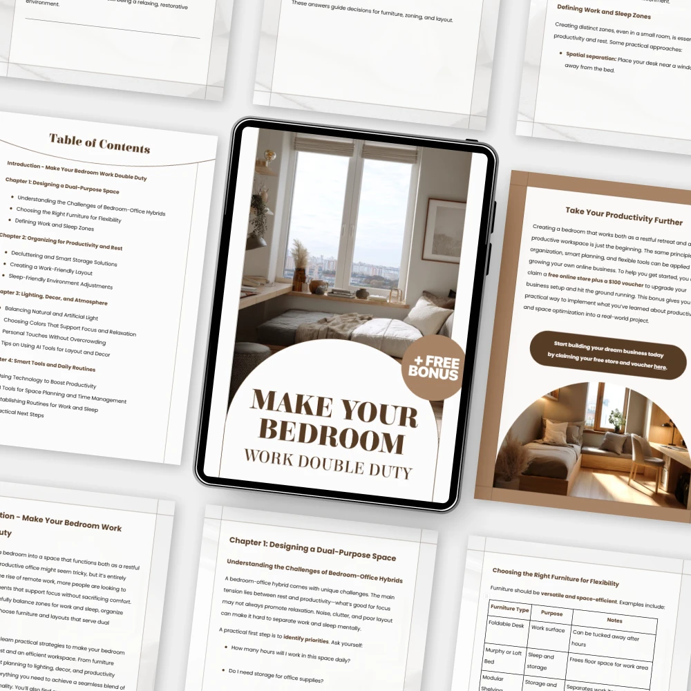 Unlike generic interior design eBooks, Make Your Bedroom Work Double Duty blends practical design strategies with modern technology. You’ll learn not just what to do, but how to do it—using AI tools, smart layouts, and real-life examples that make transforming your room achievable on any budget.