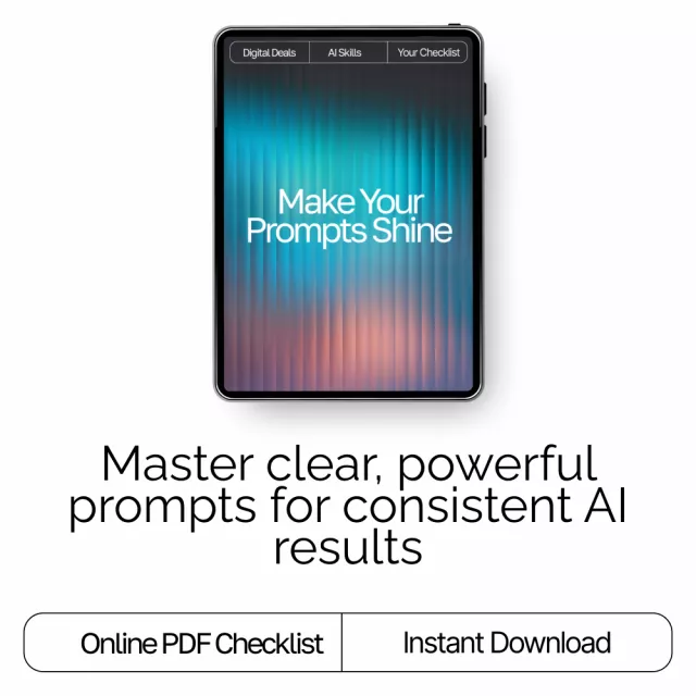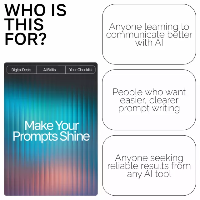 Download Make Your Prompts Shine today and start creating prompts that truly work—clearer tasks, stronger responses, and faster workflows. Your best ideas deserve prompts that bring them to life. Grab your digital checklist now and elevate every conversation with AI!