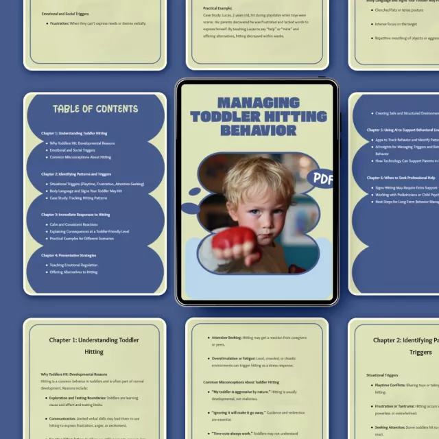 Managing hitting can feel overwhelming, emotional, and confusing—especially when you want to respond in a loving way that actually works. Managing Toddler Hitting Behavior is a thoughtfully designed digital eBook that helps parents understand why hitting happens and what to do in the moment and beyond. This guide breaks down toddlers hitting behavior in a clear, compassionate, and realistic way, so you can stop reacting out of frustration and start responding with confidence.