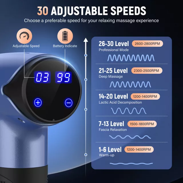 This massage gun is built with precision and versatility in mind. Equipped with a high-torque motor, it offers a percussion range of 1200 to 2800 RPM, ensuring targeted treatment for every muscle group. Its LCD touch display makes speed adjustments simple, while the powerful 2500mAh battery delivers up to 2.5 hours of uninterrupted use on a single charge. Despite its strength, the massage gun operates at a whisper-quiet 45 dB, allowing you to relax without distractions. Lightweight and portable, it’s easy to take to the gym, office, or anywhere you need instant relief.