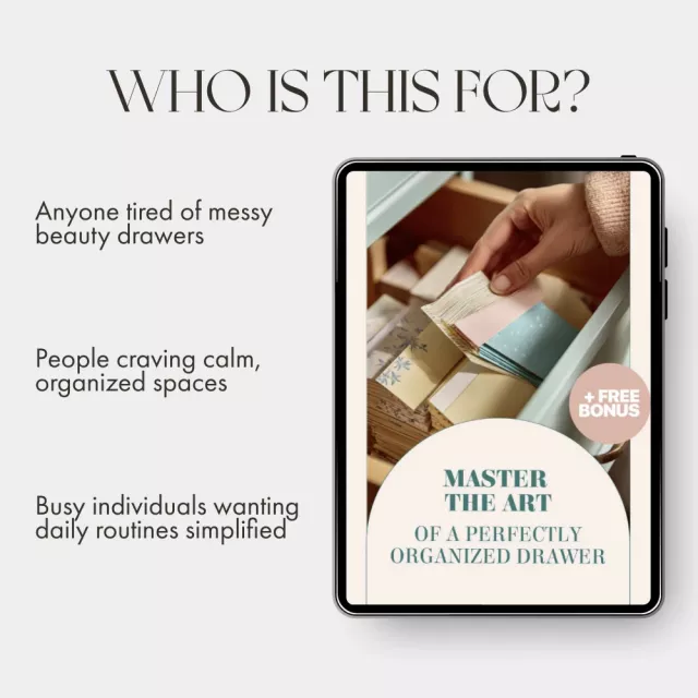 This guide is ideal for anyone who wants to streamline their beauty routine, from makeup artists and skincare collectors to minimalists seeking serene simplicity. If you’ve ever Googled “how to organize a vanity drawer” and felt overwhelmed by the options, this eBook brings clarity and creativity together in one place.