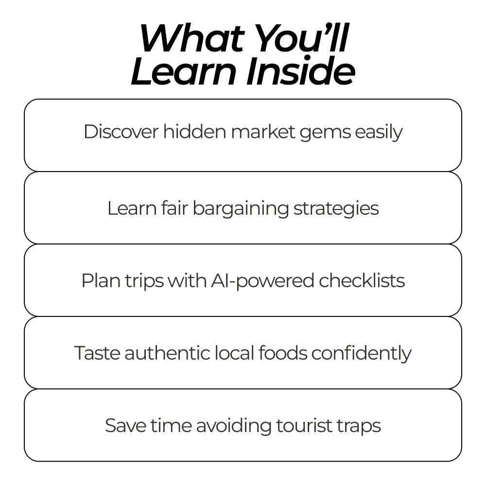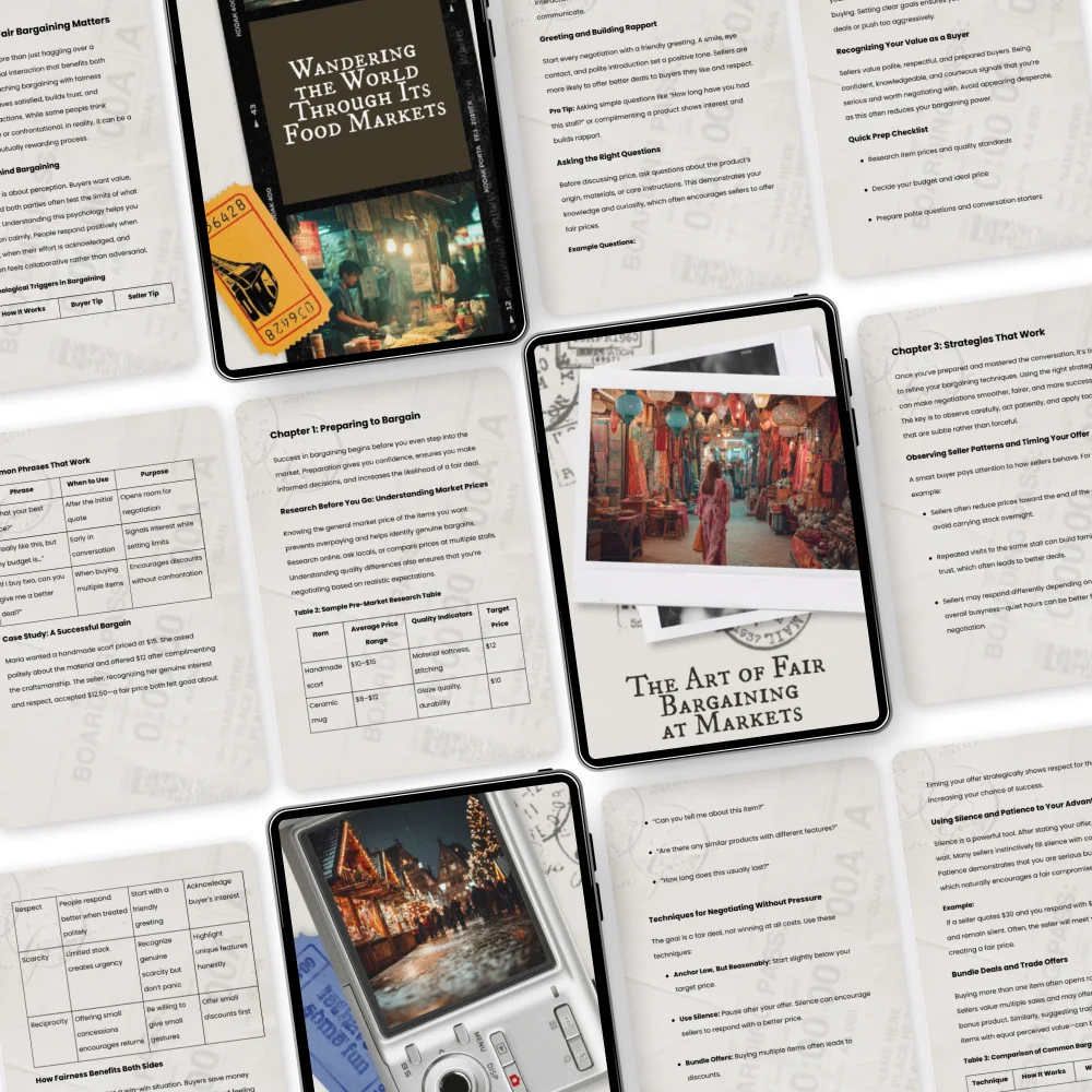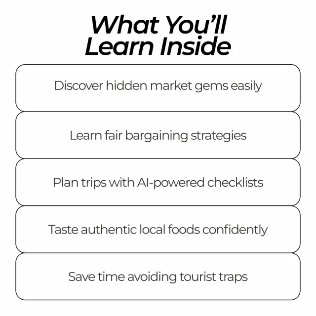 Unlike other digital travel resources, this bundle combines traditional market guides with AI-powered tools and practical checklists. You get both the cultural insights and the smart planning tools needed to truly master the art of market exploration. With step-by-step advice on bargaining, tasting, and finding hidden gems, it’s a complete guide for authentic, memorable experiences.