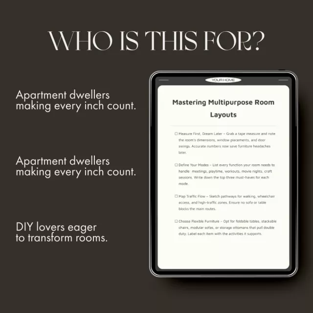 This digital download is ideal for anyone craving more function from their home: busy families, apartment dwellers, small business owners, interior design students, and DIY enthusiasts who want clear, professional-level guidance on how to layout multipurpose rooms.